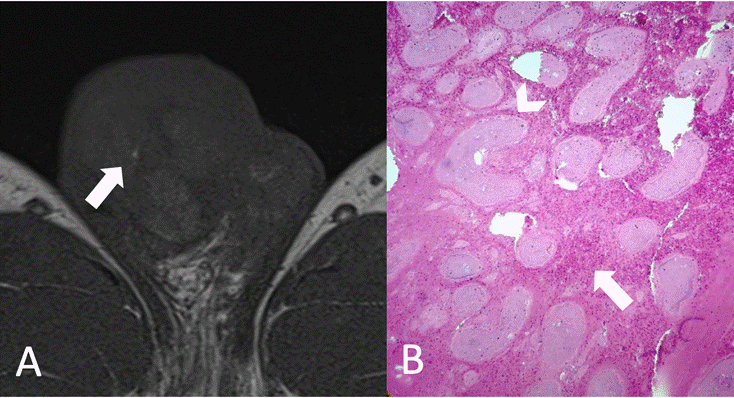 A) Imagen axial secuencia T1. Áreas puntiformes hiperintensas vinculables a microhemorragias por estasis sanguínea (Flecha). B) Parénquima testicular constituido por túbulos seminíferos necróticos (Cabeza de flecha) rodeados por un estroma con microhemorragias e infiltrado inflamatorio linfocitario (Flecha). Origen: Servicio de Diagnóstico por Imágenes. Hospital Italiano de Buenos Aires. Buenos Aires, Argentina. 2021.