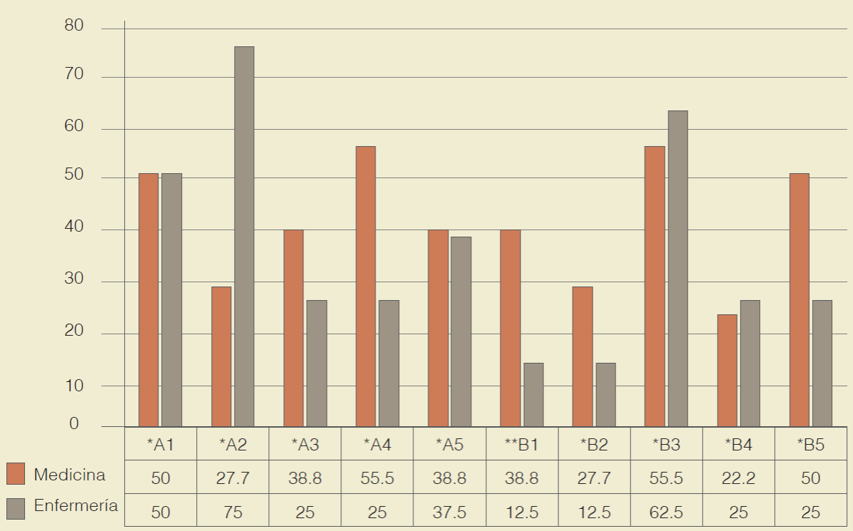 Figura 1 Comparación de porcentajes de respuestas correctas del cuestionario entre médicos y enfermeros.
