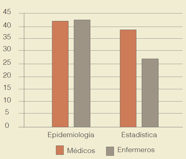 En nuestro estudio en relación a conocimientos sobre estadística los médicos (38,8 %) tuvieron mayor puntaje que los enfermeros (27,5 %). Estos resultados coincidieron con otros39 que señalan que los estudiantes de enfermería tienen percepciones negativas en el aprendizaje de la estadística, situación similar que los estudiantes de medicina35.