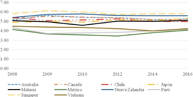 El subíndice de entorno operativo analiza el ambiente regulatorio y de seguridad que impacta el flujo de las mercancías en transporte en cada país (Foro Económico Mundial, 2008). En este orden de ideas, Singapur, Nueva Zelanda, Japón, Australia, Canadá y Malasia han mejorado dicho entorno a favor de la facilitación del comercio, llevando su indicador a puntajes superiores a 5.00 durante el periodo de análisis. Por su parte, México ocupa la última posición dentro de las economías del CPTPP (Cuadro 7).