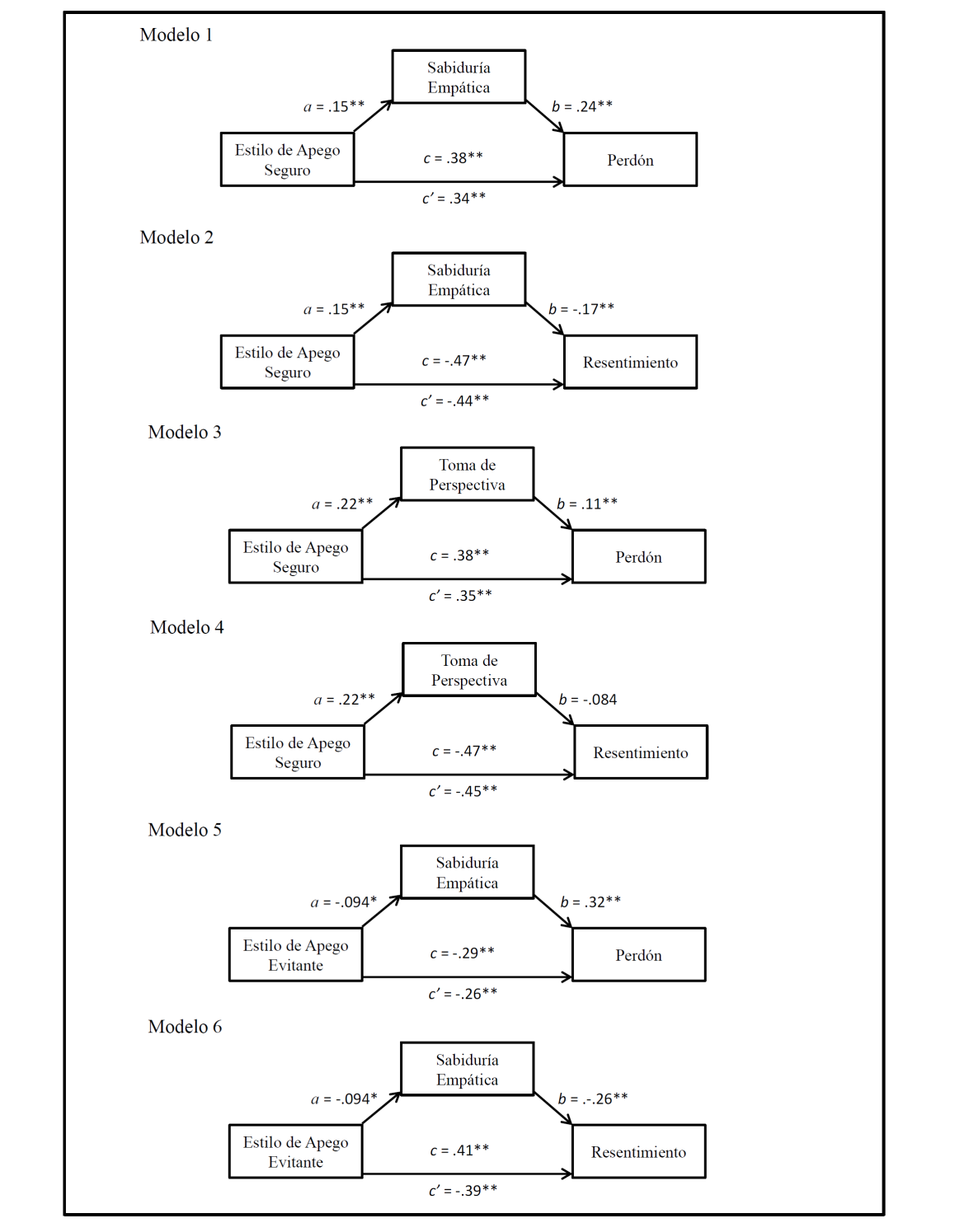 Considerando los resultados de los análisis de correlación, se analizaron seis modelos de mediación simple para probar el papel mediador de la empatía en el efecto del apego sobre el perdón y el resentimiento. A continuación se presenta la Figura 2 con la representación gráfica de cada uno de los modelos, y posteriormente su descripción y la interpretación estadística de sus parámetros.