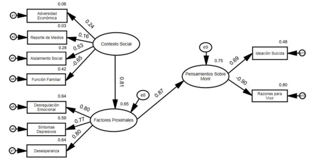 Con respecto al modelo de ideación suicida, se consideraron tres constructos: contexto social, factores de riesgo proximales y pensamientos sobre morir. La variable de contexto social incluía medidas de inestabilidad económica, notificación de los medios de comunicación sobre casos de suicidio, sensación de aislamiento social y función familiar. Se analizó la influencia de la variable contexto social sobre el constructo de factores de riesgo proximales, que se conformó con los puntajes de los instrumentos que evaluaban el estado de ánimo desregulado, los síntomas de depresión y la desesperanza. Por último, la variable dependiente pensamientos sobre morir consideró las puntuaciones de las escalas de ideación suicida actual (CSSR) y de la escala de razones para vivir (RFL).