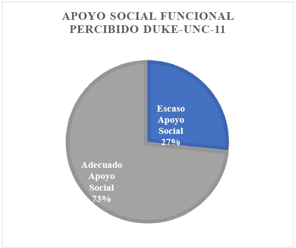 En el cuestionario de apoyo social funcional de Duke, se establecieron dos niveles de percepción de apoyo a partir de la sumatoria de todos los ítems. El puntaje máximo fue 55, el mínimo, 11; y el punto de corte, 33; para determinar dos niveles: un puntaje menor a 33 puntos se clasificó como escaso apoyo social percibido y puntaje mayor a 33 se clasificó como adecuado apoyo social percibido (Broadhead et al., 1988).