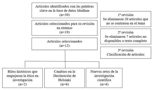 Los trabajos seleccionados fueron organizados para realizar una lectura general que permitió hacer una primera selección de acuerdo a su concordancia con el tema. Una vez generada la matriz de trabajos seleccionados se procedió a hacer la identificación de temáticas generales para luego conjuntar los trabajos que pudieron ubicarse en más de una categoría. Concluida esa fase, se realizó una lectura más detallada para identificar por consenso la interrelación de los trabajos. Los resultados se presentan agrupados en categorías de acuerdo a lo siguiente: 1) Hitos históricos que empujaron la ética en investigación; 2) Cambios en la Declaración de Helsinki; 3) Nuevos retos de la investigación científica y 4) Investigación ética y ética en investigación figura 1.