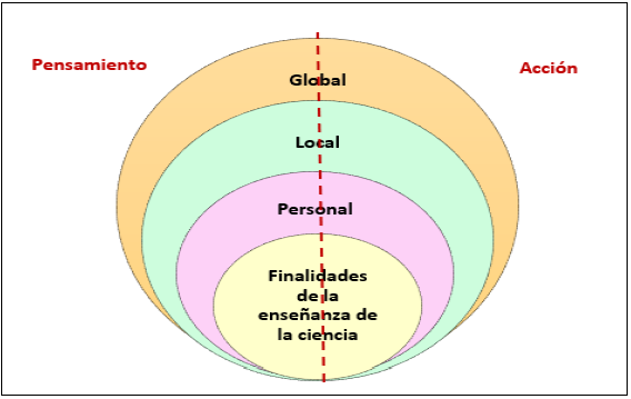 Cabe agregar que los objetivos de la enseñanza de ciencia en ámbitos preuniversitarios deben corresponder al entorno personal, local y global del estudiante, como se expresa en la Figura 3. La importancia de esto radica en que el alumno comprenda su propia cultura y con ello desarrolle un pensamiento crítico, reflexivo y propositivo.