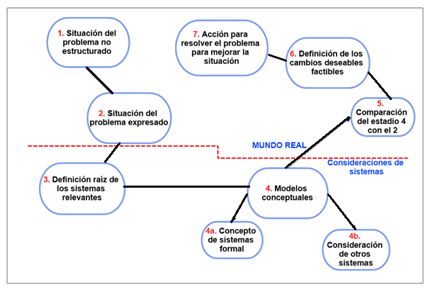 El esquema anterior se fragmenta en dos partes, integradas por las fases 1, 2, 5, 6 y 7, las cuales están inmersas en el mundo real. Las fases 3 y 4 están incluidas en el pensamiento sistémico. A continuación, se define brevemente en qué consistió cada una de las partes de la metodología de Checkland.