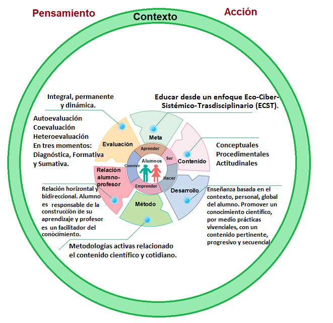 Constructivismo: Considera los conocimientos previos del estudiante, sus experiencias e intereses con el fin de aplicarlos a su entorno personal, local y global (Sanmartí y Márquez, 2017). De esta manera, convierte al estudiante en el protagonista del proceso educativo, siempre por medio del desarrollo del pensamiento analítico, crítico, creativo que promueva la construcción del conocimiento y se oriente hacia la ciencia (Pantoja y Covarrubias, 2013).