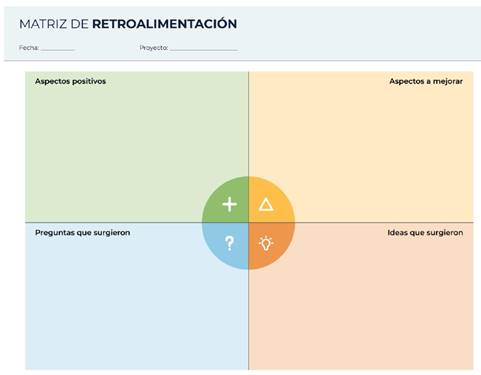 La matriz de retroalimentación o malla receptora de información, es una herramienta utilizada para el testeo de prototipos de innovación en la metodología del Design thinking; se utiliza para representar de forma sistemática, ordenada y visual las observaciones y/o comentarios que tienen los usuarios seleccionados (diNNgo). Al investigar sobre herramientas de retroalimentación por pares no se encontraron referencias sobre su uso en el ámbito educativo; no obstante, en esta investigación se utilizó la matriz de retroalimentación para la recopilación de información valiosa sobre la apreciación del prototipo informático desarrollado por los estudiantes.