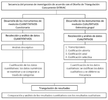 En el campo de la educación arquitectónica, las prácticas y experiencias son muy diversas, por lo que la utilización del método mixto permite la obtención de un panorama detallado y preciso. Se utilizó el diseño de investigación para métodos mixtos llamado Diseño de Triangulación Concurrente (DITRIAC), en el cual la recolección y análisis de datos cuantitativos y cualitativos se lleva a cabo de manera simultánea. Los análisis se efectúan por separado y al final se realiza una validación cruzada entre los datos cuantitativos y cualitativos (Fig. 1). Los resultados se comparan y discuten a profundidad en la etapa de interpretación (Hernández et al., 2014).
