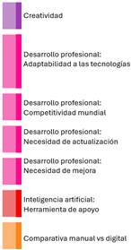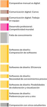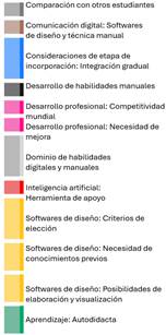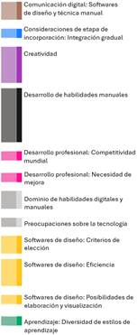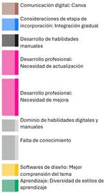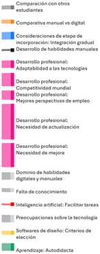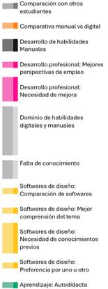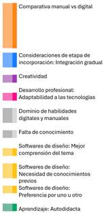 • Los estudiantes mencionaron que la enseñanza con técnicas manuales va en descenso y que esta tendencia continuará. Es decir, que está ocurriendo un desplazamiento de las técnicas manuales por la utilización de las herramientas digitales: “Creo que en algún punto se va a dejar de diseñar un poco más a mano, o sea, sí lo estamos aprendiendo, pero creo que es un poquito menos y siento que va a ir bajando como esa necesidad”.