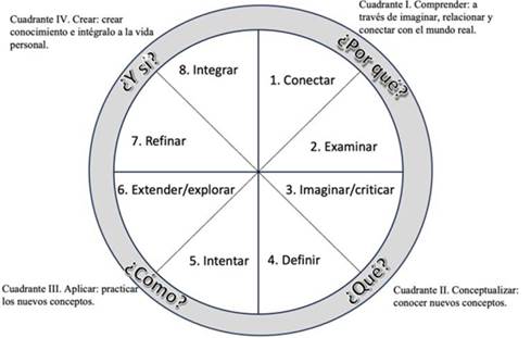 En este cuadrante se fomenta la habilidad de extender el alcance de su conocimiento ya asimilado, para refinar las estrategias de su aplicación, identificar posibilidades de integrarlo con otros conocimientos y detectar cómo colaborar en la solución de problemas más complejos. Entonces está listo para el “¿y si?” (Conde, 2017; McCarthy, 1982).