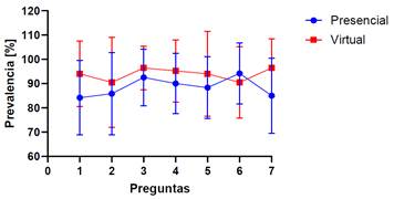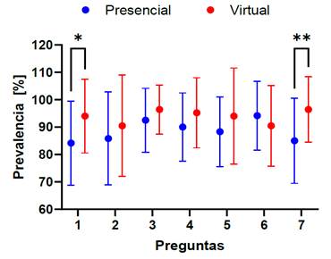 Figura 4 Comparación de la percepción del cumplimiento de los objetivos de las clases presencial y virtual, obtenida a partir de las preguntas del cuestionario, con *P adjusted <0.05, **p adjusted<0.005