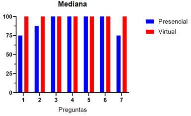 Figura 5 Mediana de la percepción del cumplimiento de los objetivos del 4MAT de las clases presencial y virtual.