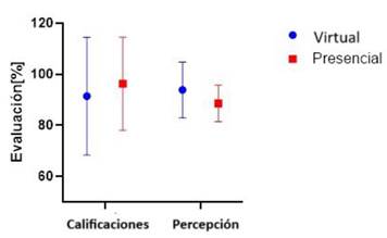 Se observó que hubo mayor deserción en el presencial, y al hacer una comparación entre los dos grupos con la prueba t-student con α= 0.05, no se encontró una diferencia significativa (p <0.05) entre el desempeño de los dos grupos, mientras que la evaluación muestra que ambos grupos cumplieron satisfactoriamente el curso.