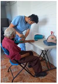 Algunas de las actividades desarrolladas en el área gerontológica fueron la toma de signos vitales en cada visita realizada en el Ejido (Figura 2), se trabajó de manera individualizada algunos ejercicios para estimulación cognitiva, abarcando las áreas de atención, percepción, comprensión, memoria, lenguaje, velocidad de procesamiento y razonamiento. Se les entregó material de actividades para trabajar en casa, los cuales fueron revisados en las visitas posteriores.