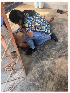 De igual forma se implementó la musicoterapia, para regular su estado de ánimo y pláticas sobre una alimentación saludable. Algunas actividades se realizaron de manera grupal en la Casa de Salud y el resto de las actividades se realizaron visitando a las personas en sus domicilios (Figura 3 y 4), siempre en compañía de docentes, alumnos y el secretario particular del Agente.