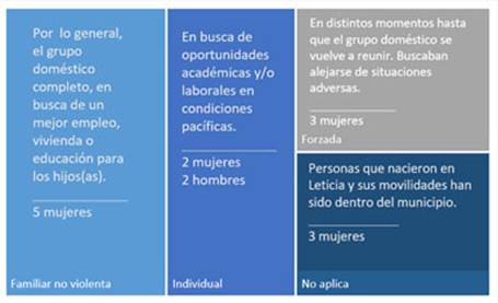 A partir de las entrevistas, se identificaron tres formas de movilidad más frecuentes: familiar no violenta, individual y forzada. Aunque puede ocurrir una combinación de dos o más tipos a lo largo de una trayectoria de vida, para efectos del análisis se tuvo en cuenta el tipo de movilidad que propició la llegada de la persona a Leticia.