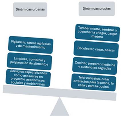 En esta comparación visual se subrayan las diferencias y similitudes en los modos de vida y las ocupaciones en ambos contextos: a la derecha se presentan las “Dinámicas Propias” de los pueblos amazónicos, destacando la diversidas de tareas estrechamente ligadas a su territorio; a la izquierda, las “Dinámicas Urbanas”, cuyos oficios son limitados y hasta precarizados para la población indígena. Esto concuerda con lo señalado por Bello y Rangel (2002), quienes afirman que existe cierta segregación para los indígenas en empleos y sectores específicos, como en el comercio -a menudo informal-, el trabajo por cuenta propia y el servicio doméstico -en el caso de las mujeres-.