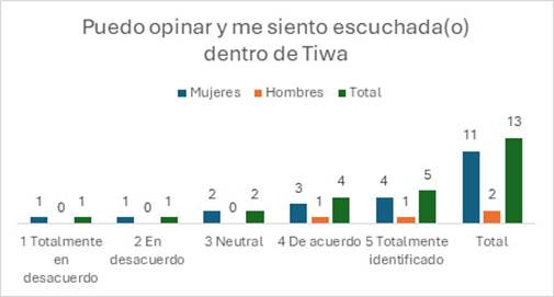 Lo observado y el testimonio de Cecilia contrasta con las respuestas obtenidas en la entrevista. Por ejemplo, con la frase “Puedo opinar y me siento escuchada(o) dentro de Tiwa, usted se siente”, dos mujeres expresaron que están en desacuerdo, dos fueron neutrales, tres estuvieron de acuerdo y cuatro se sintieron totalmente identificadas (ver Figura 4).
