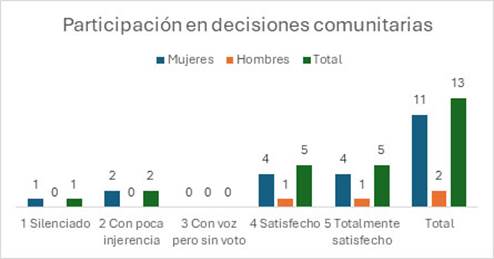 A continuación, se presentan los resultados a la pregunta: “En los espacios de participación para la toma de decisiones comunitarias, usted se siente: silenciado, con poca injerencia, con voz, pero sin voto, satisfecho y totalmente satisfecho” (ver Figura 5).