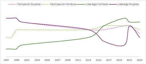 Figura 6 Nivel de participación y liderazgo de mujeres y hombres en el cabildo Tiwa desde 1997 al 2023