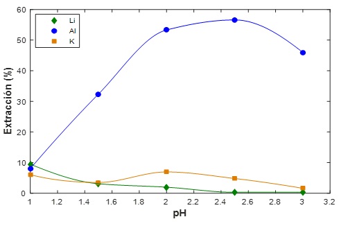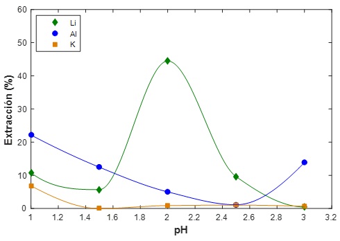 Cuando se realizan las pruebas con el extractante Cyanex 272 al 5%, 8% y 10% (v/v) se observó que al incrementar el pH (1 a 3) de la solución, disminuía el % de extracción. Donde en una solución acusa a un pH de 1, se obtuvo el 9.16% de extracción de Li, 4.89% de K y 8.42% de Al.