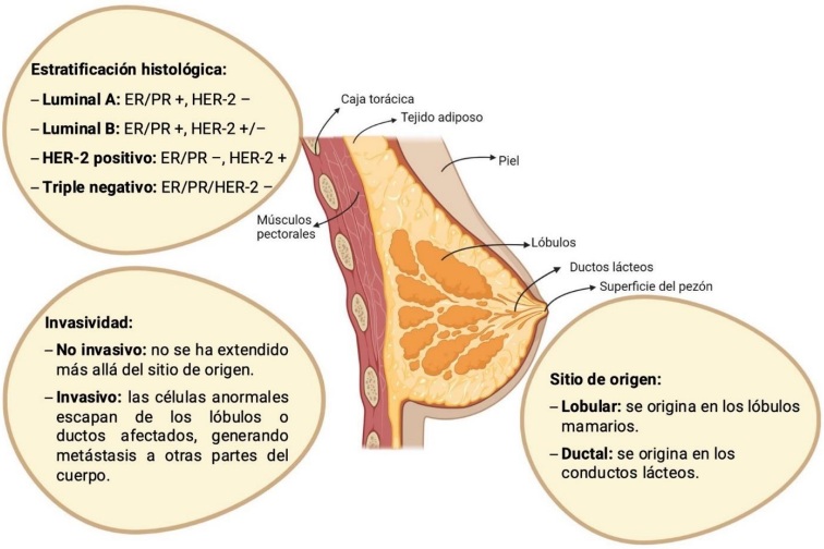 Por otro lado, el cáncer de mama también se puede clasificar por su sitio de origen; en lobular, es decir, proveniente de los lóbulos, o ductal, proveniente de los conductos lácteos. Otra clasificación divide el cáncer de mama en no invasivo e invasivo [4]; el tipo no invasivo es aquel que no se ha extendido más de los lóbulos o ductos de donde se ha originado, por ejemplo, el carcinoma lobular in situ (LCIS, por sus siglas en inglés) y el carcinoma ductal in situ[11]. Por su parte, el cáncer de mama invasivo ocurre cuando las células anormales que están dentro de los lóbulos o ductos afectados escapan y entran en contacto con tejido mamario. Estas células pueden escapar del tejido de la mama y llegar a diferentes partes del cuerpo a través de la circulación sanguínea y el sistema linfático. Dentro de esta clasificación está el carcinoma lobular infiltrante (ILC), carcinoma ductal infiltrante, carcinoma medular, carcinoma mucinoso, carcinoma tubular, la enfermedad de Paget mamaria y el tumor Phyllodes de mama [12].