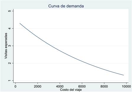 En la Figura 2 se observa la curva de demanda recreativa de la RBPGDA, estimada mediante el método costo del viaje. La cual muestra una relación inversa entre el costo del viaje y el número de visitas esperadas a esta ANP. Es decir, a medida que aumenta el costo del viaje para acceder al sitio, disminuye la frecuencia de visitas.
