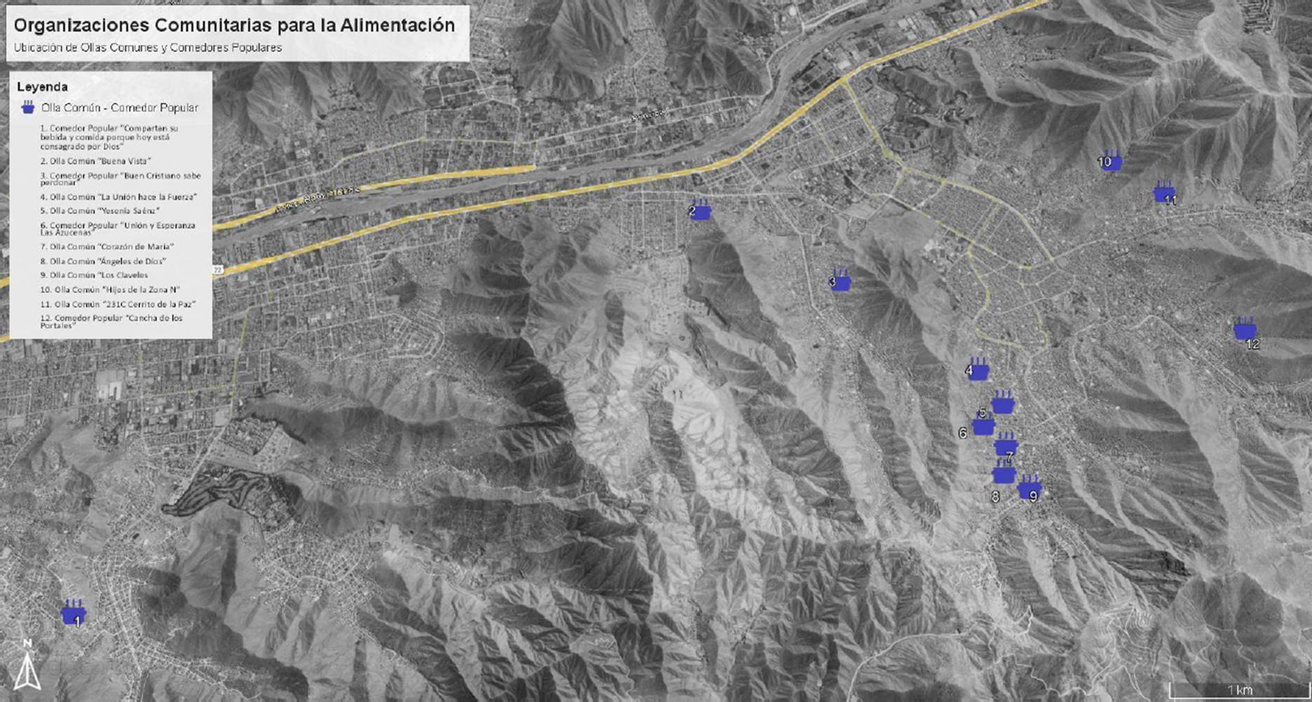 Tres de las organizaciones que se incluyeron en el estudio se encuentran fuera de Huaycán, pero están ubicadas también en el distrito de Ate. Se tomaron en cuenta debido a que sus miembros realizan desplazamientos hacia Huaycán a fin de abastecerse de alimentos y otros insumos necesarios para el funcionamiento de sus organizaciones. Otro punto importante respecto a la ubicación de las organizaciones es que once se encuentran en las zonas altas de las pendientes, como se muestra en la Figura 1. En contraste, solo dos ollas comunes se encuentran en una zona baja.