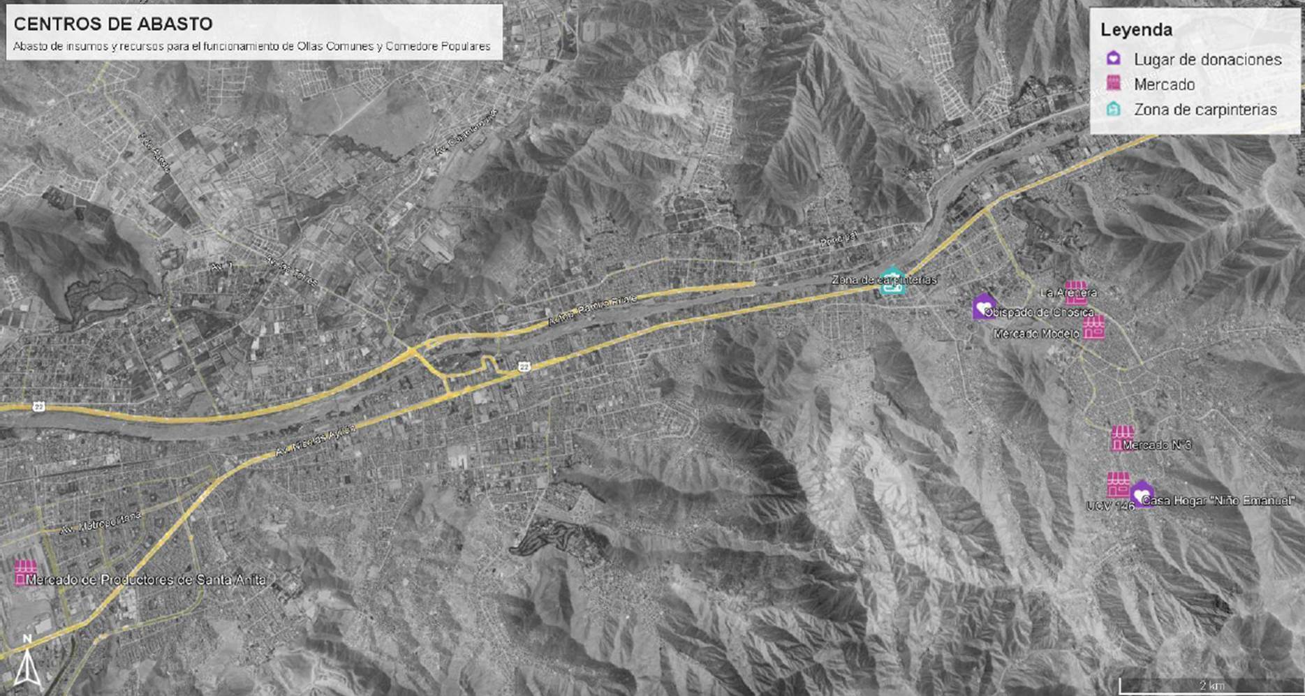 Las actividades de abastecimiento y recojo de donaciones de víveres son los principales motivos de desplazamiento. Tanto las ollas comunes como los comedores tienen la necesidad de movilizarse diariamente para conseguir víveres frescos para la preparación de alimentos, pese a que los segundos reciben asistencia alimentaria del gobierno local. Por lo tanto, es fundamental identificar los establecimientos a los que recurren las organizaciones comunitarias para abastecerse de insumos alimentarios. Como se muestra en la Figura 2, estos se encuentran distribuidos en un área geográficamente extensa, con una notable dispersión entre sí, y respecto a las ollas comunes y comedores populares, lo que acentúa los desafíos logísticos y de movilidad para las personas involucradas en dichas organizaciones.