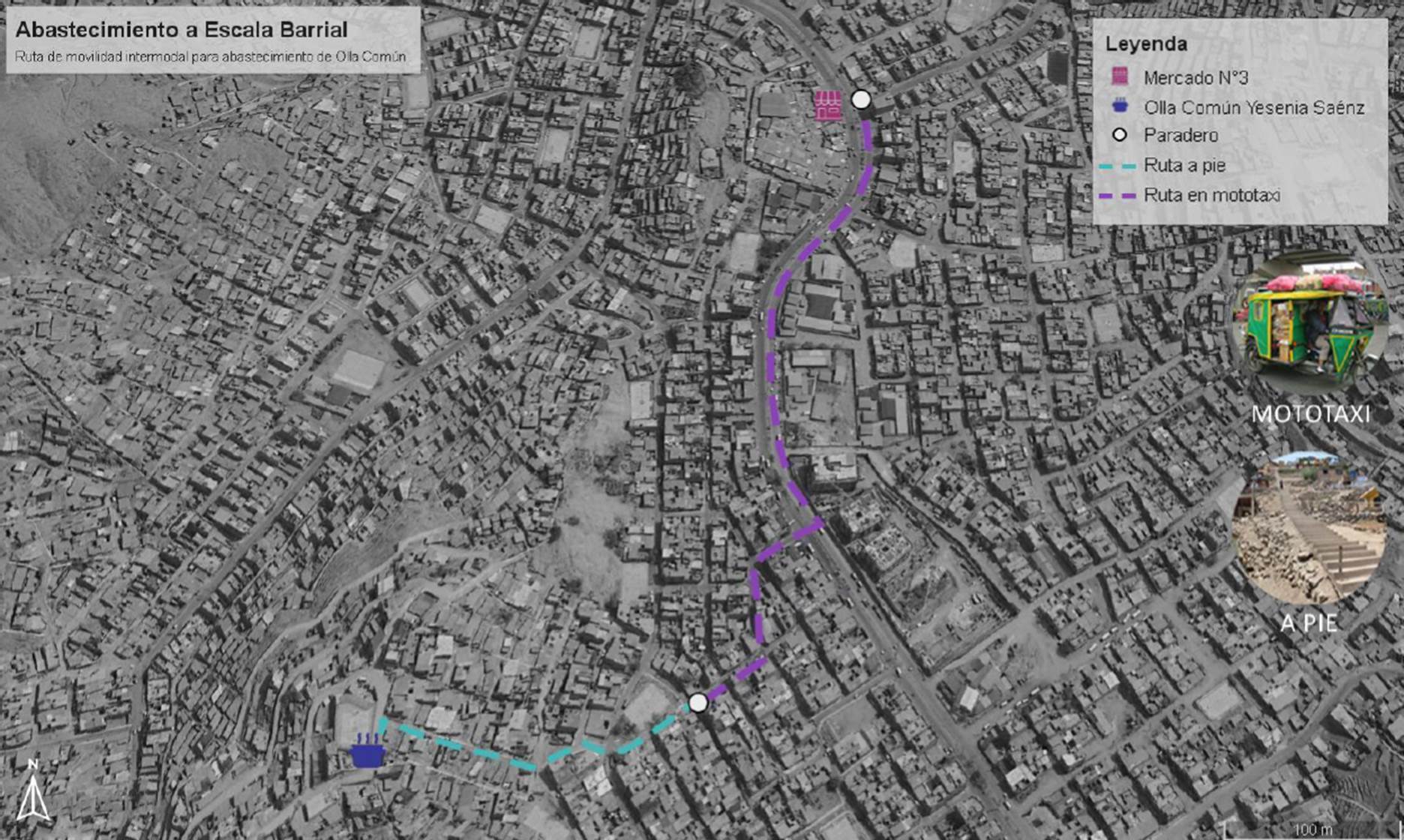 En la Figura 3, se aprecia el recorrido diario de la olla común Yessenia Sáenz para el abastecimiento de alimentos en el Mercado N° 3 de Huaycán, con una duración de 20 minutos aproximadamente. El recorrido de ida inicia con el descenso de la pendiente a pie (cinco minutos) para poder llegar al parcero de una calle principal, tras lo cual hacen un breve recorrido en mototaxi hasta el mercado (15 minutos). El trayecto de regreso es similar, a excepción de que las lideresas van cargadas de bolsas de víveres que deben cargar a través de la pendiente.