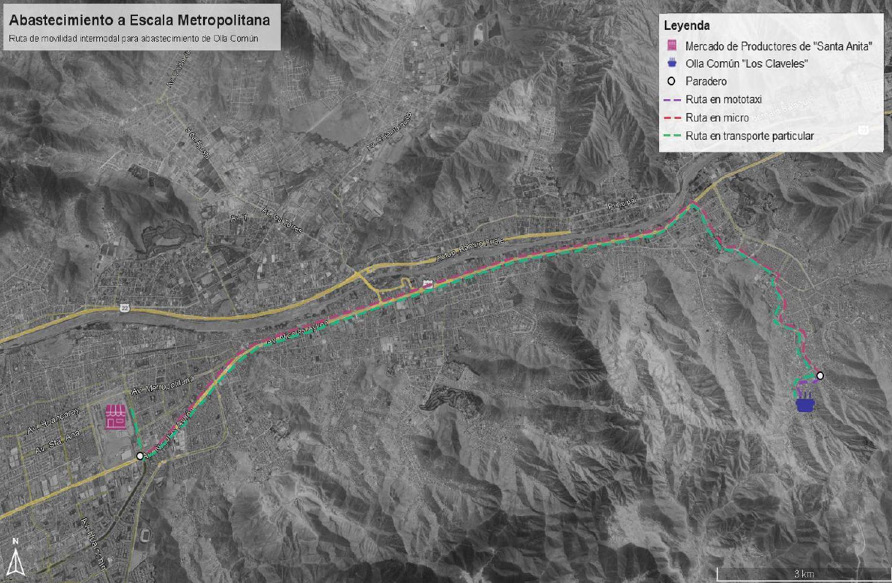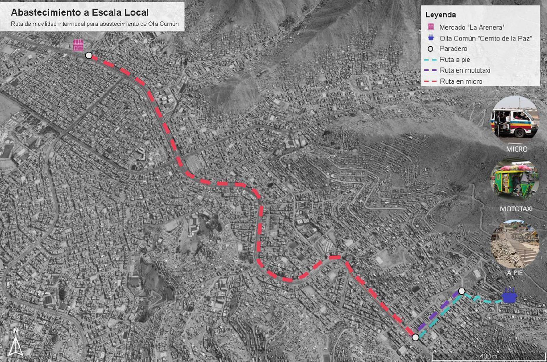 La Figura 4 muestra el trayecto recorrido por la olla común Cerrito de la Paz hacia el Mercado La Arenera, que se realiza una vez a la semana con una duración total de 30 minutos. El recorrido inicia a pie (cinco minutos) para llegar al paradero donde las lideresas deben tomar la mototaxi que las lleva a la avenida principal para tomar el micro (cinco minutos). Sin embargo, dependiendo de la disponibilidad de recursos, algunas veces optan por realizar el primer recorrido a pie hasta la avenida (15 minutos aproximadamente). El trayecto en micro se lleva a cabo en 20 minutos.
