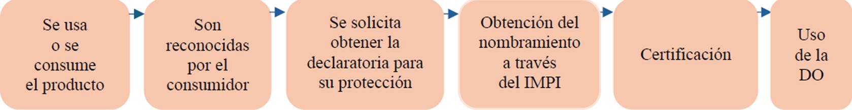 La acción colectiva asentada en el territorio es una importante herramienta de preservación del patrimonio (Rodríguez, 2007), destacando aquéllas donde los recursos agroalimentarios son interpretados como capital cultural (Pérez et al. 2021), el cual puede ser acumulado, invertido o intercambiado para generar procesos de dinamización económica del territorio (Salas, Medina y Vázquez, 2020), aspecto ligado a la complejidad cultural de un recurso valorizado (Tregear et al., 2007). De acuerdo con Espeitx (1996) existe una relación inmanente entre alimentos y territorio, la cual es una construcción social y biocultural, relación que tiende a desdibujarse de múltiples maneras por las fuerzas homogeneizantes de los conglomerados agroalimentarios globales. Sin embargo, productos con un marcado origen territorial y arraigo cultural como el mezcal, develan profundos procesos de anclaje territorial (Domínguez, 2020) que, no pocas veces, despliegan mecanismos de resistencia frente a la globalización. En México, las denominaciones de origen son una herramienta para la protección de los productos anclados al territorio, las cuales operan bajo la Ley de la Propiedad Industrial que, en su artículo 156, establece que se refieren a productos vinculados a una zona geográfica de donde son originarios, determinadas por su calidad inmersa en los factores naturales y culturales (LPI, 2020). En México, el IMPI es la autoridad administrativa a nivel institucional encargada de emitir declaratorias de protección de denominación de origen y de autorizar su uso. En la Figura 1 se presenta la transición para que un producto solicite dicha declaratoria.