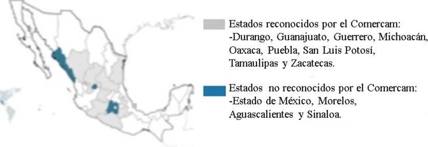 Actualmente, el destilado se produce en 24 de los 32 estados de la República mexicana, pero sólo 13 están incluidos en la norma. Por otro lado, el Consejo Mexicano Regulador de la Calidad del Mezcal (Comercam) solo reconoce a nueve debido a controversias jurídicas con los cuatro estados no reconocidos. En la Figura 2 se presenta en color gris la distribución de los estados que son reconocidos, en contraste con los que actualmente enfrentan procesos legales que impiden su certificación, mismos que se indican en color azul.