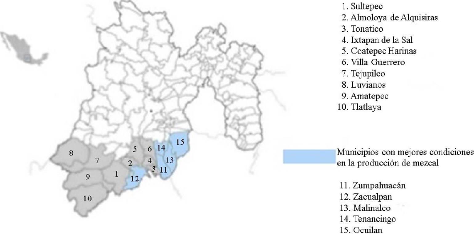 Por otro lado, a nivel estatal, la situación es similar: De los 15 municipios descritos en la ampliación de la norma, se estima que cinco son los que presentan mejores condiciones. En la Figura 3 se aprecian en color azul los municipios con mejores condiciones productivas y mayor profundidad histórica, aspecto que pone en evidencia que el cumplimiento de las condiciones normativas para acceder a la denominación de origen se distribuyen, asimétricamente, entre los distintos territorios.