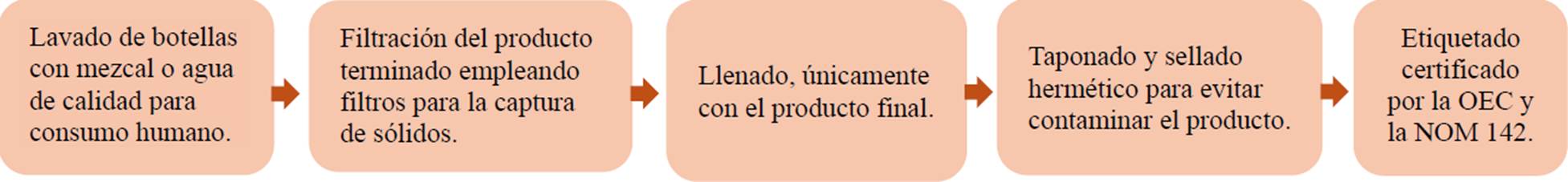 Inicialmente, los productores malinalquenses centraron su producción en mezcal joven. Con el paso del tiempo, reservaron algunos lotes para generar madurados en vidrio, reposados y añejos, depositando garrafones de vidrio bajo suelo, para después extraerlos. Durante los últimos 10 años, se ha registrado el incremento en la producción de abocados de frutas silvestres. En las comunidades estudiadas se detectaron las seis clases de mezcal, donde predominó el mezcal joven. El envasado está regido por la autorización del OEC bajo las siguientes condiciones: las instalaciones deben contar con diferentes líneas cuando se trabaje con productos distintos; la venta a granel se destina exclusivamente al mezcal blanco; se determina la inexistencia de ajuste alcohólico y, en caso de tenerlo, será sujeto a un segundo análisis del porcentaje alcohólico. Para los mezcales clase reposado, madurado en vidrio, añejo, abocado y destilado con mezcal, se requiere contar con análisis de laboratorio cuyos resultados demuestren el cumplimiento de los parámetros (sólo para el caso de mezcal abocado se permite un máximo de 60 g/l. conforme a la NMX-V-006-NORMEX-2013). Tomando lo anterior como referencia, en la Figura 6 se presenta el tratamiento del producto terminado el cual debe envasarse manual o mecánicamente cumpliendo con al menos cinco etapas.