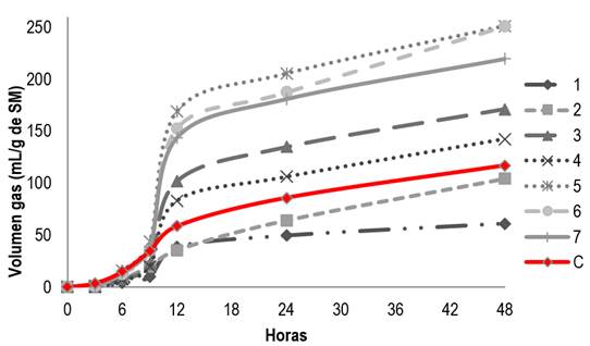 Los extractos fueron adicionados de manera individual en cada una de las jarras de digestibilidad, en diferente volumen (Agarwal et al., 2009); como control se utilizó el sustrato de alfalfa sin la adición de aditivos. La producción de gas in vitro se determinó empleando el método propuesto por Theodorou et al. (1994); para lo cual se utilizaron unidades de fermentación (UF) de 120 ml para cada muestra. En el registro de gas producido, se utilizó un medidor de presión marca Sper Scientific; la presión de gas fue acumulativa y determinada en unidades de presión (Psi); el tiempo de medición fue a las 3, 6, 9, 12, 24 y 48 h. Para cada volumen de los diferentes extractos, se realizaron tres repeticiones.