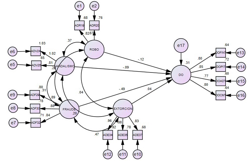 Figura 3 Modelo Estructural de Actividades delictivas y desempeño organizacional