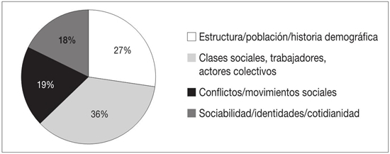 En el segundo conjunto de estudios convergen investigaciones sobre la formación histórica de clases sociales, trabajo y trabajadores tanto libres como coaccionados. Suman 35.6% y se han desplazado de temas clásicos como los obreros, la industrialización, el mundo fabril, los enclaves mineros, las condiciones de vida y los salarios, a los trabajadores informales, clases medias, dependientes de comercio y pequeños comerciantes. Así, los artículos reunidos en esta categoría se han ocupado de sujetos fundamentales tras la transformación del orden corporativo, pero también de actores colectivos que surgieron y se consolidaron como parte del proceso de modernización y urbanización. En tal sentido, resulta fundamental entender la formación histórica de identidades, como artesanado, clases populares, proletariado y artesanado urbano. Estos trabajos ameritarían un examen más profundo, y debe decirse que han abonado a estos campos diversas generaciones de historiadores profesionales: desde Silvio Zavala, Luis González y Jan Bazant, hasta Clara E. Lida, Jean Meyer, Pablo Yankelevich, Sonia Pérez Toledo, Carlos Illades, Daniela Marino y Mario Barbosa. En sus inicios, se trató de una agenda guiada por dos rasgos que se volvieron tendencia: conflicto y desigualdad, plasmada sobre todo en visiones sobre los trabajadores y migrantes en una importante variedad de expresiones.