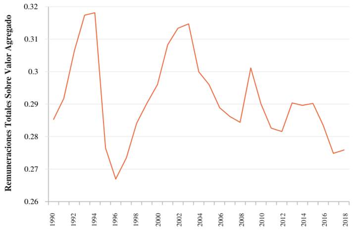 La reducción de la participación de los salarios en el producto no es un fenómeno reciente. Samaniego (2014) y Ros (2015) argumentan que la disminución de la participación del trabajo se ha acentuado de forma aguda debido a las diversas crisis económicas por las cuales ha atravesado el país, como la crisis de la deuda de 1983, en paralelo con la caída de los precios del petróleo de 1986, que impactaron de forma negativa el mercado de trabajo, lo cual terminó en la contracción de los salarios reales de manera importante, lo que llevó a una fuerte pérdida del poder adquisitivo de miles de trabajadores en los diversos sectores formales de la actividad económica.