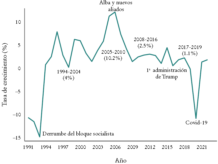 La vulnerabilidad mostrada ante la pandemia respondió tanto al aislamiento financiero del país debido al embargo como a los problemas acumulados en periodos anteriores. En la Gráfica 1 se muestra el patrón de crecimiento de la economía cubana después del shock de la crisis de los años noventa; éste se caracteriza por un desempeño relativamente bajo e inestable. Detrás de ese comportamiento subyacen fallas estructurales e institucionales, y, de forma crucial, factores externos, como se corrobora en múltiples estudios (Hidalgo, 2022; Hidalgo y Triana, 2022).