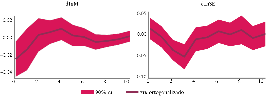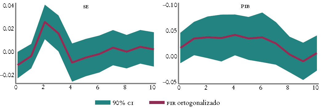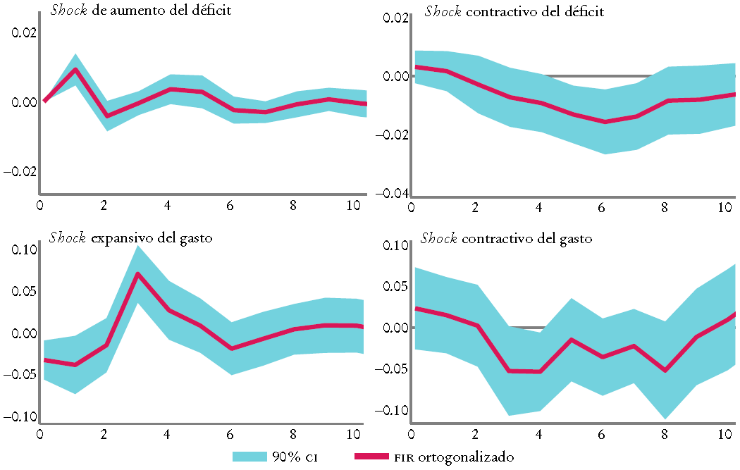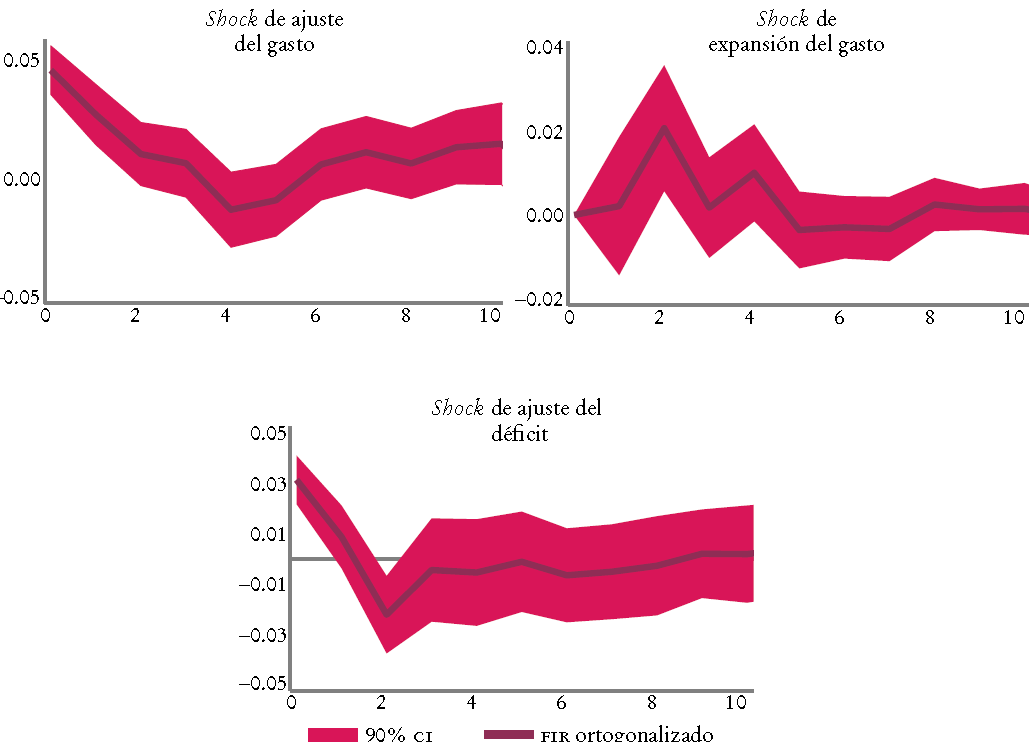 Obsérvese, no obstante, que después de esta reacción expansiva se produce un ajuste de ambas variables. Este patrón se acerca a lo que la literatura describe como “ilusión fiscal”, es decir, una situación en la cual se elevan los ingresos debido a shocks transitorios, lo que ocasiona niveles de gastos por encima de sus valores históricos difíciles de sostener en el tiempo.