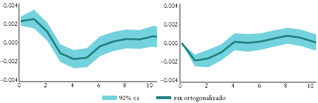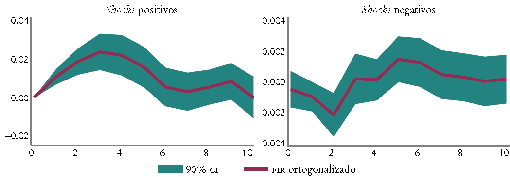 Gráfica 9 FIR de la brecha del producto ante shocks positivos y negativos (en ese orden)