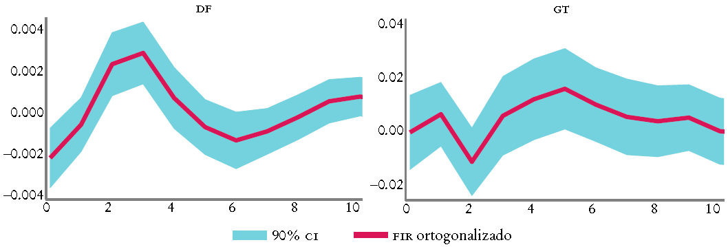 Gráfica 12 Respuesta del DF y GT ante shocks en el producto