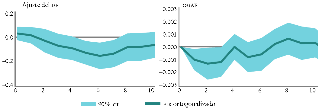 En tercer lugar, los modelos confirman los hallazgos anteriores en relación con la prociclidad de la política fiscal. En la Gráfica 12 se observa cómo un shock de crecimiento del PIB real por encima del PIB potencial se traduce en un aumento tanto del DF como del GT; en el primer caso se prolonga aproximadamente cuatro años; en el segundo, hasta un año y medio.