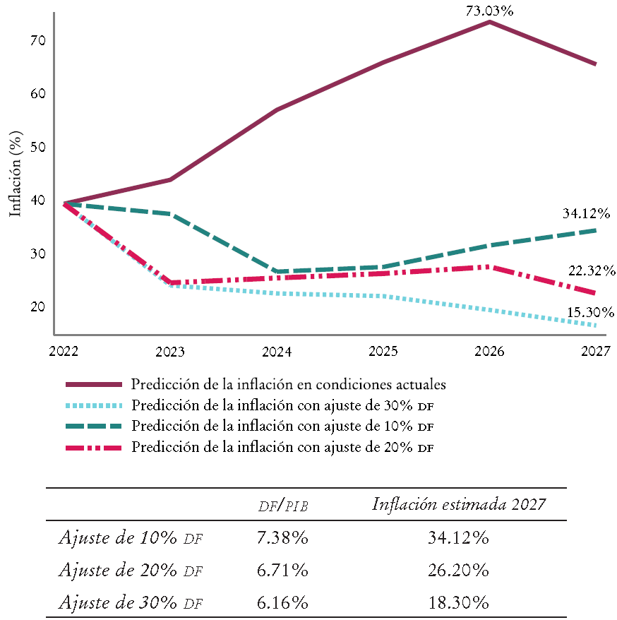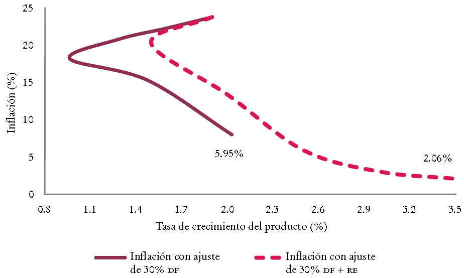 Por otro lado, los escenarios de ajuste gradual son más alentadores. Nótese que al actuar de manera conservadora, como describen los dos primeros escenarios, la inflación decrece, pero se mantiene por encima de 25% tras cuatro años de iniciado el programa de estabilización. Sólo con un ajuste del déficit de 30% se produce una caída sustantiva e inmediata de la inflación, pues alcanza una cifra en 2027 de 18.3%, y así se mantiene la trayectoria del resto de variables (crecimiento del producto y sector externo) que intervienen en el modelo.