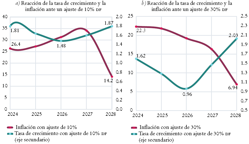 Para complementar el análisis anterior se realizó un ejercicio prospectivo en el que se proyecta a partir de 2023 y hasta 2028 la respuesta conjunta de la tasa de crecimiento y la inflación ante el ajuste de 10 y 30% del déficit fiscal. Los resultados se resumen en la Gráfica 19.