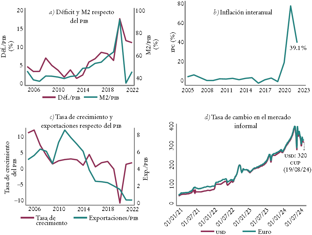 La sobrerreacción de la tasa de cambio en el mercado informal fue casi inmediata, lo que expresa el desequilibrio monetario, la escasez de oferta de bienes y servicios en moneda doméstica, y un alto grado de especulación e ineficiencia (García-Figal, Lage-Castellanos, Amaro y Mulet, 2024). Ello provocó el colapso del mercado cambiario oficial que operaba en el sector de hogares (Sociedad Mercantil Cubana Casas de Cambio, S. A., o Cadeca). Previsiblemente, los precios desregulados se alinearon a la evolución de la tasa de cambio y resurgió un mercado informal dinámico. La inflación superó la cifra de 70% en 2021 y se mantuvo en casi 40% en 2022 según cifras oficiales.