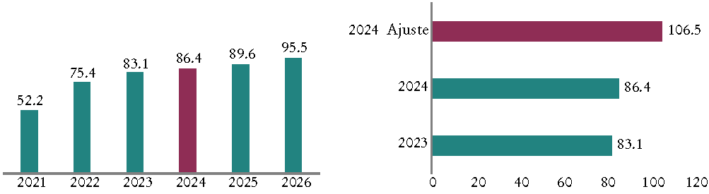 Gráfica 6 Trayectoria estimada deuda/PIB en condiciones actuales para tres años (panel izquierdo) y estimación deuda/PIB de 2024 con ajuste de tasa de interés (panel derecho)