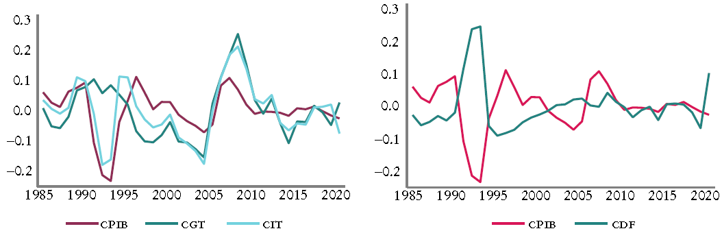 A lo largo de las series, tanto del déficit como del gasto, se observan shocks con cierta persistencia en el tiempo. Asimismo, el patrón irregular de las variables fiscales y del PIB son similares, pues se observa que incrementos del PIB se traducen en deterioro del saldo fiscal. Este comportamiento sugiere la posible existencia de prociclidad del gasto y, en menor medida, del déficit.